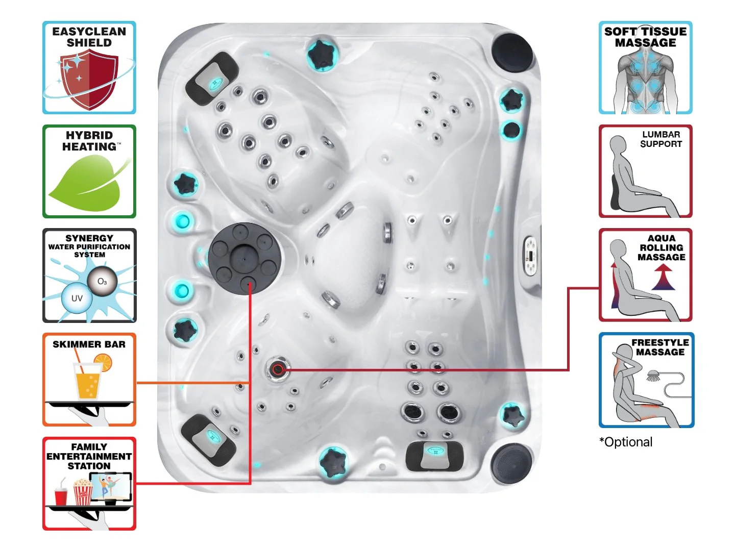 Passion Spas Happy on Fonteyn Spas Signature Collectioni uusim mudel. See ühendab endas 1 mugava lamamiskoha ja 3 iste Aqua Rolling Therapy intensiivse massaažiga. Lamamiskoht pakub mugavat istumist erineva pikkusega inimestele ning võimaldab mitmesuguseid massaažiteraapiaid. Bassein on varustatud ulatusliku LED-valgustuspaketiga, mis muudab selle atraktiivseks õhtuti madala valguse korral või väljas öösel. Kõik juhtnupud ja peatuged on aktsentvalgustusega, mis koos Passion Spasi helisüsteemiga loob maagilise atmosfääri.